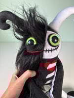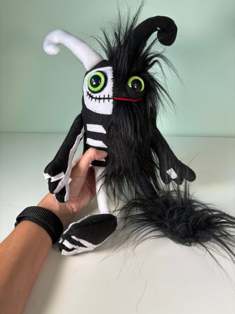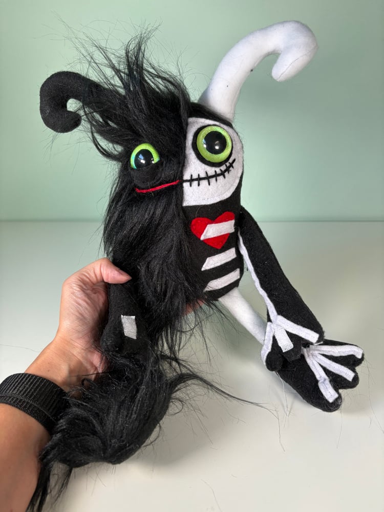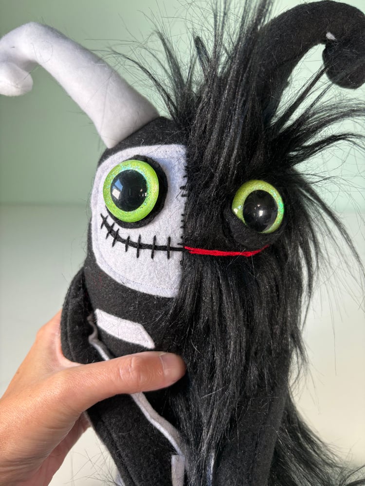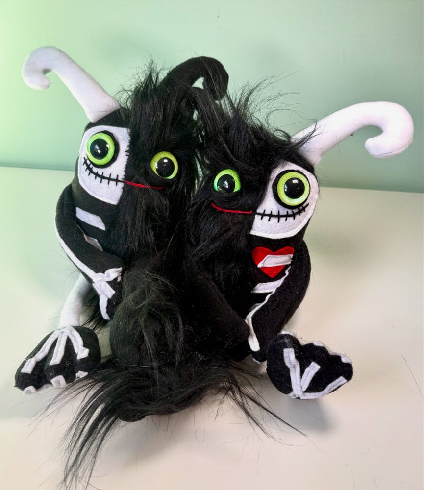 These monsters are have fluffy, huggable monsters and half spooky, soft skeletons. They have hand embroidered details, hand painted safety eyes (best suited for ages 3 and up, colors vary), and they are stuffed with brand new fiber fill.