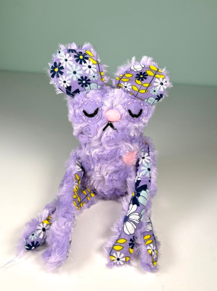 He can sit anywhere and he is small enough to carry around in a purse or bag. This guy has hand embroidered details, he is weighted with plastic poly beads in this limbs and base and he is stuffed with brand new fiber fill.
