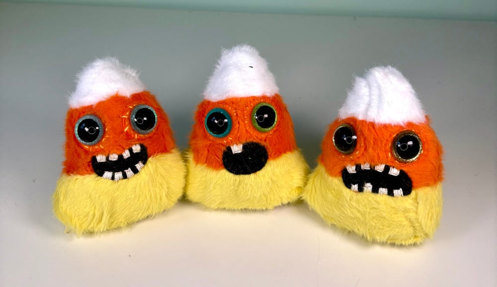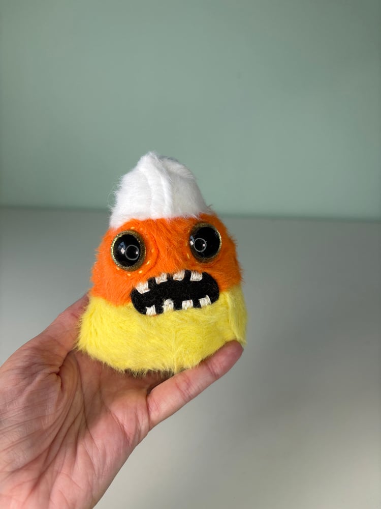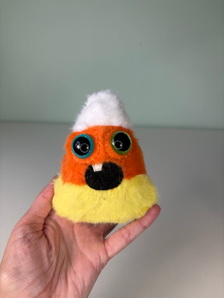 These weighted minky candy corns are much better than real candy corn. Best of all they don’t taste like wax, although I don’t recommend eating them. They have safety eyes (best suited for ages 3 and up), hand embroidered details and they are weighted with plastic poly pellets in their base.