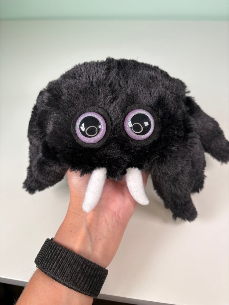 This fluffy, soft weighted spider has hand painted safety eyes (best suited for ages 3 and up). He also has plastic weight pellets in his legs and a bean bag base.
