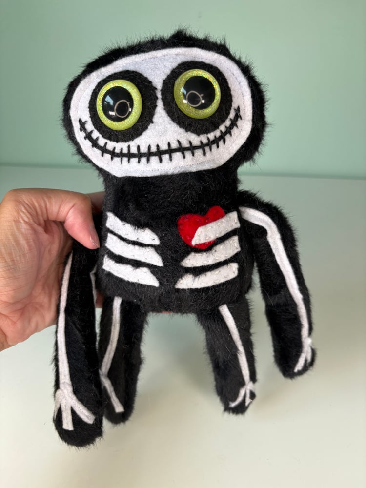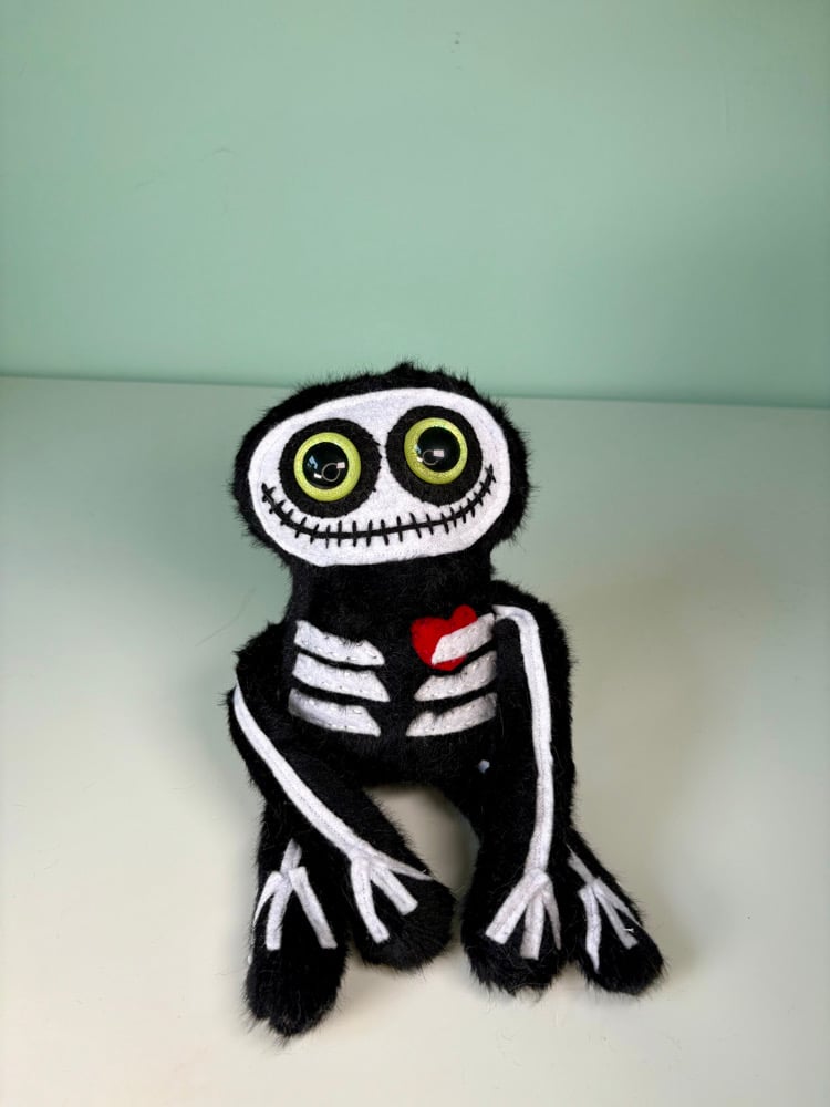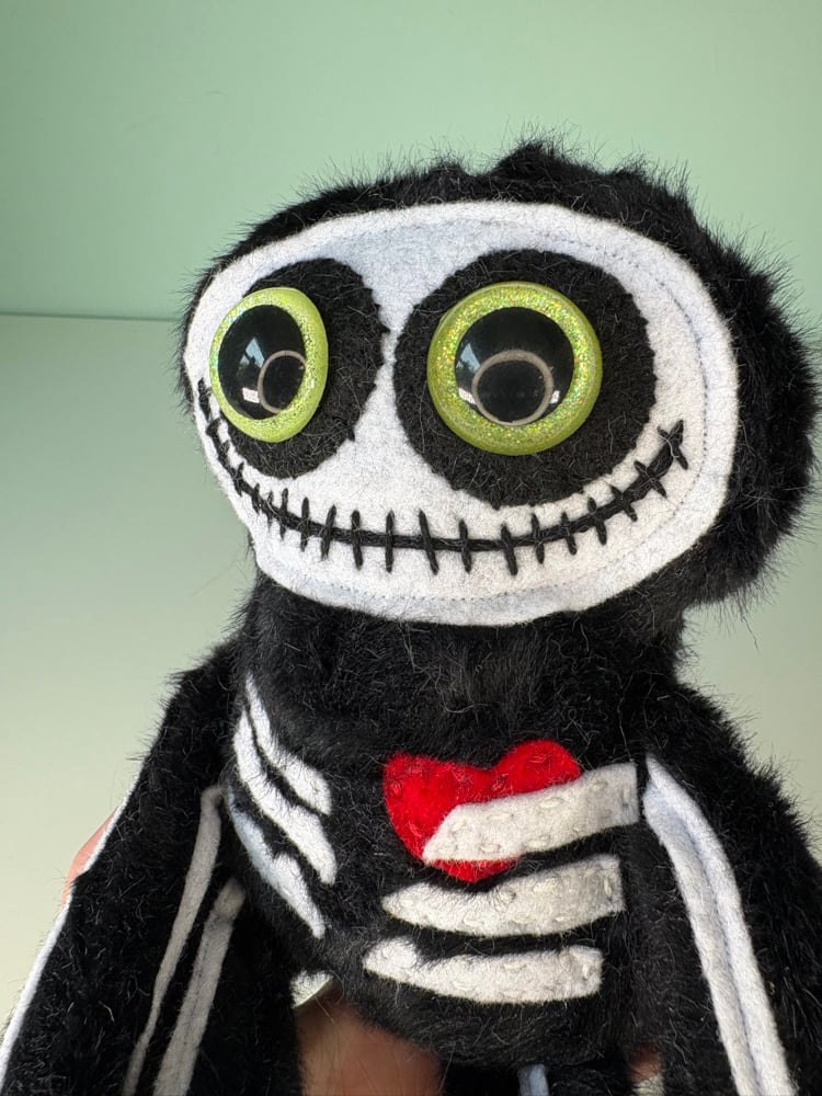This creepy guy has hand embroidered details, safety eyes (best suited for ages 3 and up), he is weighted with plastic poly beads in his limbs and base and he is stuffed with brand new fiber fill. He has safety eyes and vintage button details that are not suited for small children.