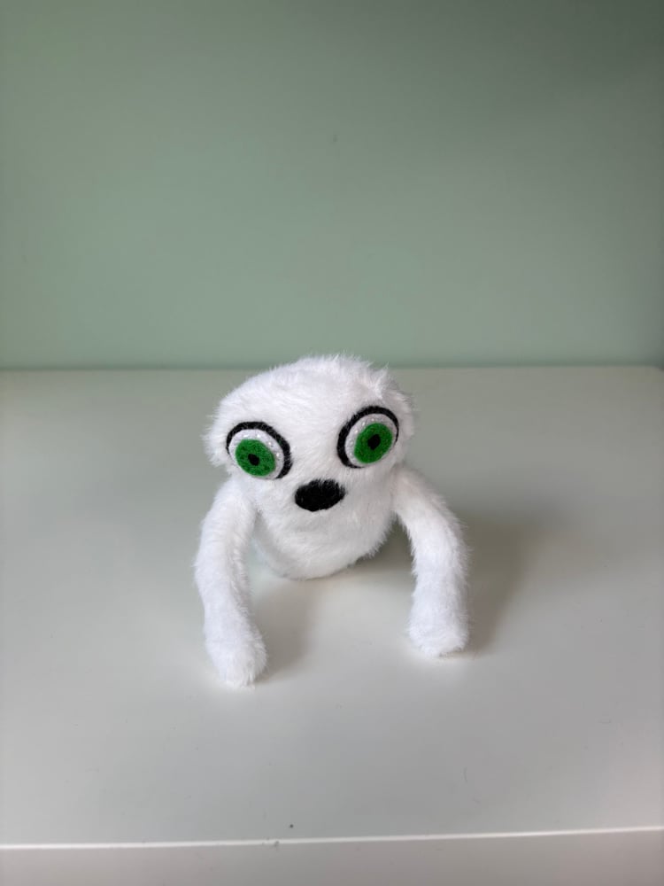 He’s weighted with plastic poly pellets and his face has hand embroidered details.