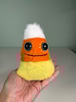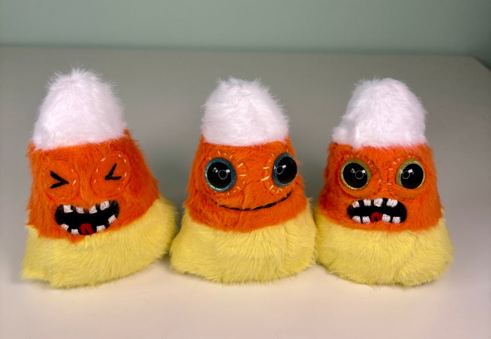 These weighted minky candy corns are much better than real candy corn. Best of all they don’t taste like wax, although I don’t recommend eating them. They have safety eyes (best suited for ages 3 and up), hand embroidered details and they are weighted with plastic poly pellets in their base.