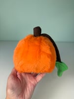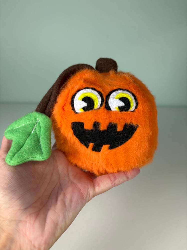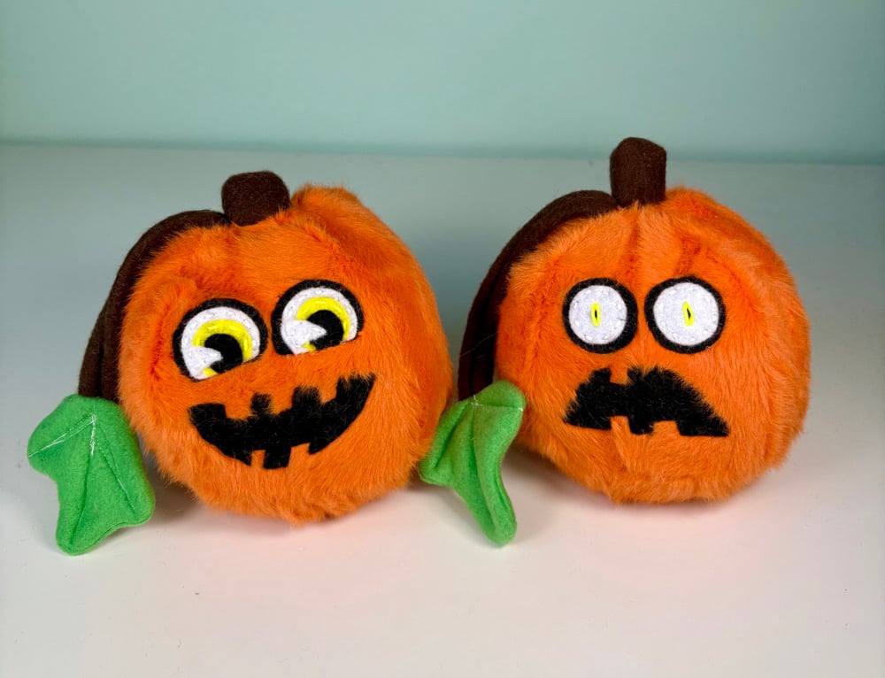 These pumpkins come in minky fabric with hand embroidered faces and faux fur fabric with safety eyes (best suited for ages 3 and up) and hand embroidered features. They are weighted with plastic poly bead beanbags in their base.