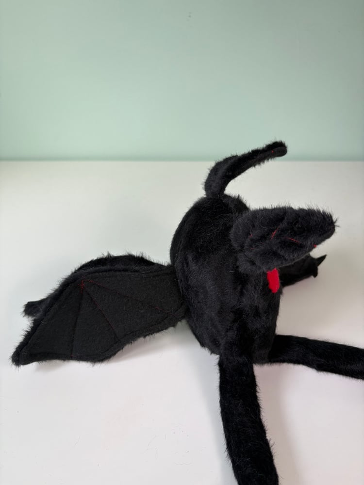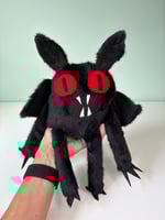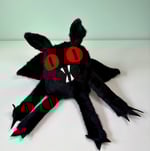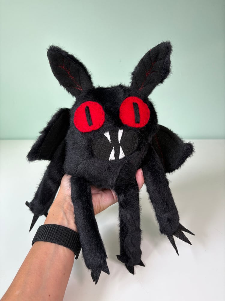 Mothman is hand embroidered and weighted with plastic poly pellets in his arms, legs and base.